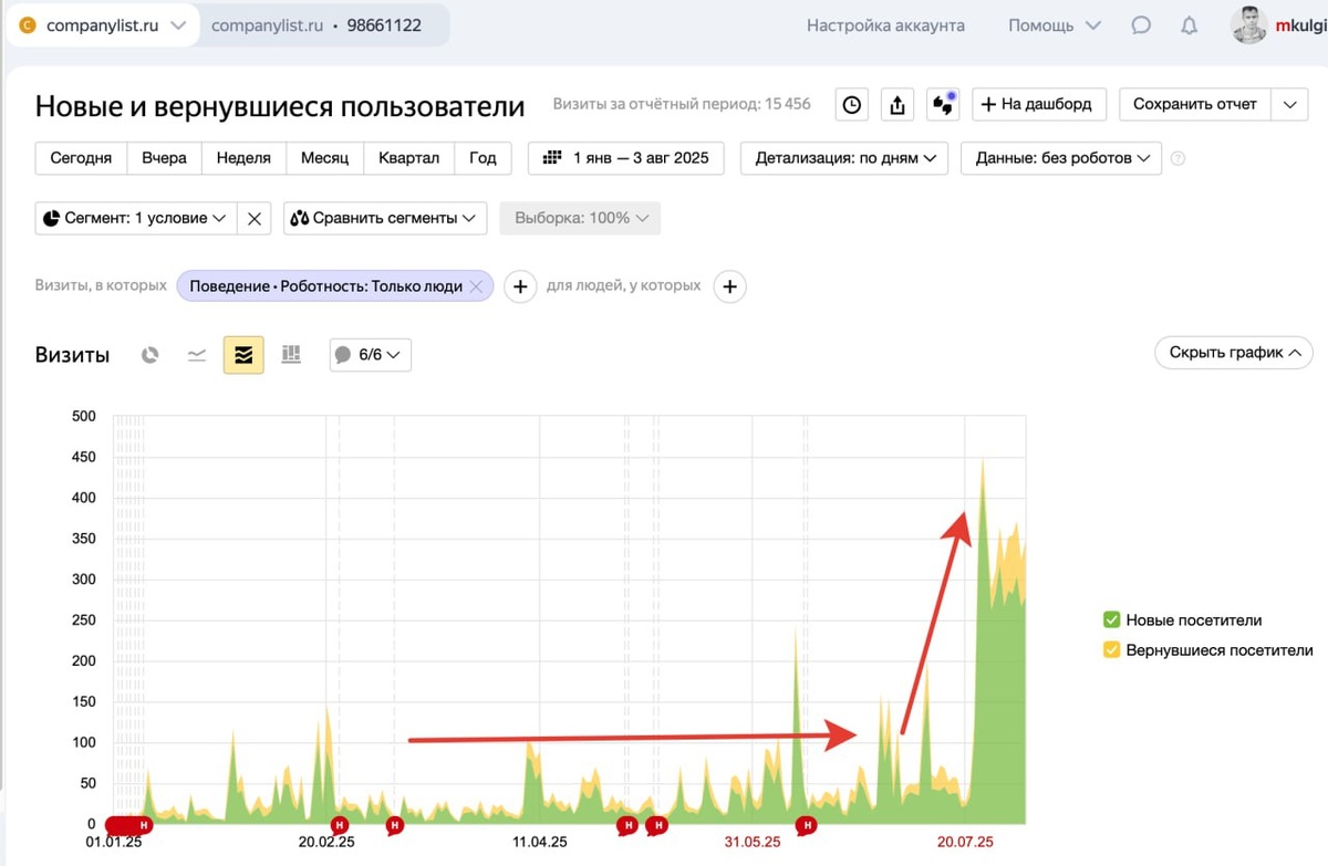 Ну, и чем это можно объяснить? Трафик на companylist.ru с момента запуска по дням... Делаем ровно ничего нового. Шах и мат, SEO - специалисты :( Хотя вру, начал вести блог с помощью ИИ и видел, что некоторые статьи стали собирать трафик. Может быть это повлияло? Как это сказывается на заказах? Их стало больше :) Ссылки не покупаем, поведенческие не крутим, рекламу не даем - НИЧЕГО. Сайт на WordPress, медленный. Но к слову - оооочень долго новые сайты раскачиваются... Русский ИТ бизнес