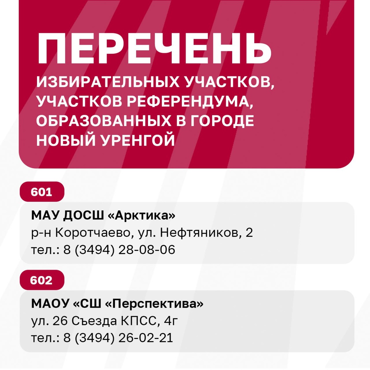 ❗️12, 13 и 14 сентября в газовой столице пройдут выборы депутатов Законодательного Собрания ЯНАО и Думы города Новый Уренгой В дни голосования можно проголосовать на своём избирательном участке или на дому в случае, если есть уважительные причины. На региональных выборах возможно отдать свой голос по месту нахождения, но в пределах Ямала. Досрочно проголосовать на своём участке будет нельзя ни на региональных, ни на муниципальных выборах. С середины августа члены участковых избирательных комиссий начнут подомовые и поквартирные обходы своих избирателей, информировать о голосовании, приглашать на выборы. Некоторые избирательные участки изменили свои адреса: размещённые ранее в помещении средней школы №7, перенесены в Центр социального обслуживания населения «Садко» и коррекционную школу №18; участок из СК «Дорожник» переезжает в новое здание СШ «Перспектива»; в Арктическом лицее образован новый участок — для жителей, прописанных в СНТ и ДНТ северного района города. Перечень избирате