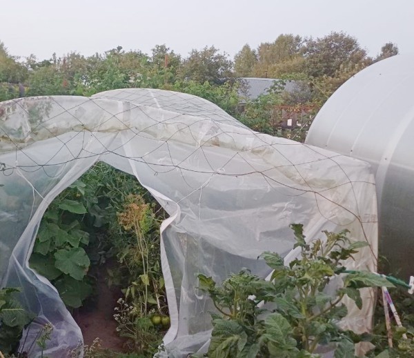 Мы тут отдохнуть решили. Съездили, погуляли по Тверской области, развеялись. Отвлеклись от садово-огородных дел. Вот только они, дела эти, от нас отдыхать не хотели. Тут, в саду, все шло своим чередом: солнышко светило, ветер дул, томаты в теплице наливались, огурцы наращивали свою мощь. И старая тепличка не выдержала. В один прекрасный день дочь, приехавшая поливать, прислала мне такие фото: Жуть, кошмар и ужас. Это эмоции мои такие были. Но тут же подумалось: "Это должно было случиться рано или поздно. Чего ноешь? Сама виновата." Потому что теплице около двадцати лет, она состоит из ПВХ дуг, которые на зиму не убираются, а летом жарятся и плавятся на солнце. Сколько веревочке не виться... Да она бы и не рухнула, если бы я (от великого ума) не подвязала кусты томатов к дугам, как в поликарбонатной теплице. Привычка, что тут поделаешь. Раньше в этой пластиковой теплице у меня росли огурцы и перцы, причем на месте нынешних томатов именно перцы, то есть нагрузка была значительно меньше.