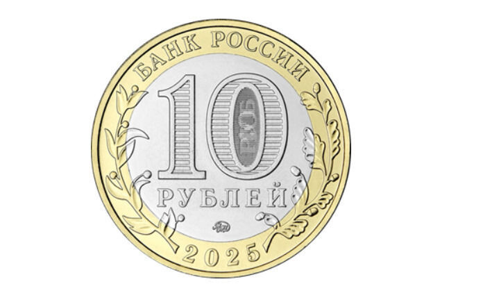 На лицевой стороне монеты на кольце расположены надписи «Банк России» и «2025», а также изображения ветвей лавра и дуба. В центре диска указан номинал «10 Рублей» с защитным элементом внутри цифры «0». В нижней части диска расположен товарный знак Московского монетного двора.