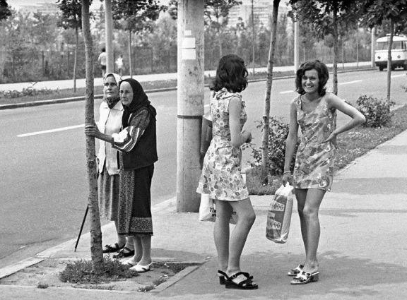 На снимке запечатлен момент культурного перехода — молодые женщины в мини-платьях 1970-х идут мимо пожилых в традиционных платках. Два времени встретились у молодого деревца, символизируя смену эпох в одном кадре.