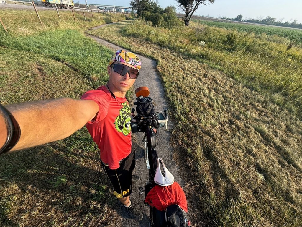 — Первую ночь я не остановился на отдых и не рассчитал, как буду питаться. С собой продуктов не осталось, а кафе и магазины долго не встречались, поэтому пришлось есть хлеб, который мне ещё дома испёк отец и дал в дорогу. Потом ночью, после второго дня пути, съехал с трассы на ночевку около леса. Я выстегнулся с педалей, так как ехал в контактной обуви, которая имеет жёсткое сцепление с велосипедом и только при определённом движении можно отцепиться от педалей. Начал скатываться ещё немного, до хорошего места, и не заметил, что одна нога прицепилась к педали. При остановке я не смог быстро выставить эту ногу и упал на бок, очень нелепо на ровном месте. Было обидно, я нервничал, испортил себе настроение на ночь, так как велосипед тяжёлый, а удар был сильным. Боялся повредить велосипед и самому травмироваться, что затруднило бы движение, но всё обошлось.