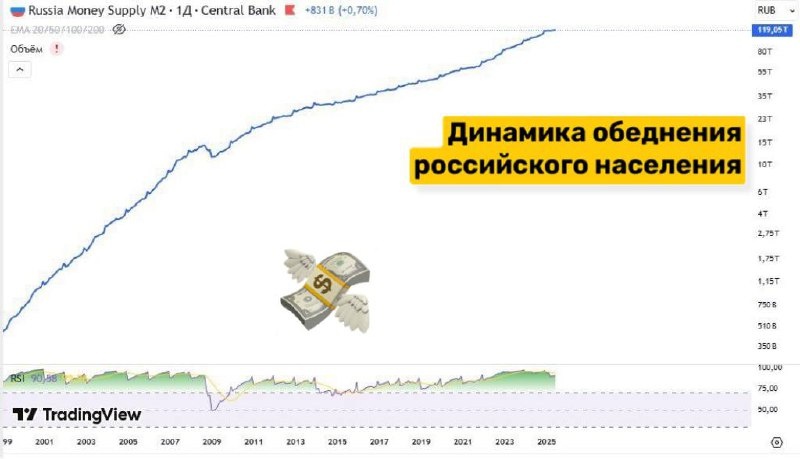 😈 Как ЦБ РФ обворовывает россиян 🇷🇺 Одна из причин почему любые инвестиции в РФ не имеют смысла: на графике показана динамика печати рублей центральным банком РФ. Всё в стране дорожает как раз по этой причине - рублей с каждым днем становится больше и они теряют свою ценность по отношению ко всему. ❓ Когда российского инвестора перестанут кидать на деньги? За всю новейшую историю был только один период, когда ЦБ выключил «печатный станок» и изъял немного ₽ из экономики - конец 2008г., тогда экономика РФ рухнула вдвое… с тех пор печатный станок рублей не выключался ни на минуту. ⚠️ Поэтому инфляция - это надолго. Также как и высокие % ставки по кредитам. У ЦБ просто нет возможности быстро снижать ставку как это привыкли делать в западных странах. 🤐 Сейчас многие хранят деньги в банковских депозитах и для них это станет большой занозонькой от Матушки земли, так как банковские вклады очень легко заморозить/конфисковать по экстремистской статье в пользу бюджета государства. Это о