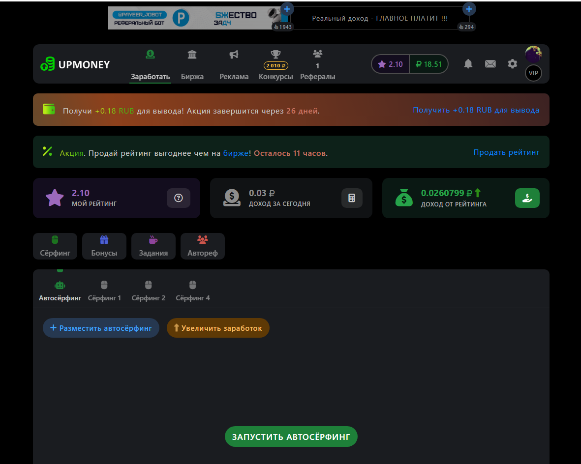 Сегодня вам расскажу о проекте UPMONEY, на котором можно зарабатывать деньги пассивно, для этого правда придется набить рейтинг, выполнив простые задания по просмотру сайтов. Итак, ссылка для регистрации https://upmoney.uno/?ref=155857. Здесь задания очень простые, а за заработанный ретинг капают деньги каждую секунду, которые можно потом вывести на различные платежные системы. Согласитесь, приятно если даже несколько копеек или рубль будут просто так капать на счет!