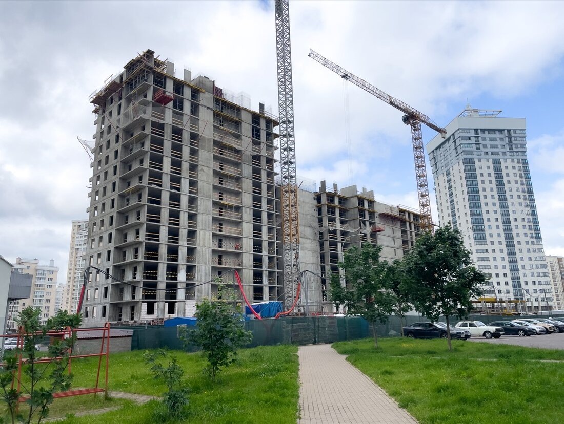 Полгода назад в Минске стартовали продажи квартир в новом жилом комплексе «Гранд Кристал». Интересная новостройка на три подъезда сейчас строится в микрорайоне Лебяжий. В последнем номере газеты «Звязда» застройщик опубликовал декларацию еще на 48 квартир. Рассказываем про цены. МинскЯндекс Карты — транспорт, навигация, поиск мест Сейчас стройка многоэтажного дома идет весьма активно. Работы ведутся уже практически на верхних этажах. Весь «кристальный» дом рассчитан на 3 секции, 12−16−25 этажей и 422 квартиры. Помимо квартир, в доме запланированы коммерческие помещения на первом этаже и пристроенный двухэтажный паркинг на 68 мест. Жилье в многоэтажке будут сдавать с черновой отделкой, которая предусматривает штукатурку стен и перегородок, розетку для электроплиты, установку унитаза в санузле. С верхних этажей дома будут открываться панорамные виды на окрестности. По первоначальной декларации цены в ЖК «Гранд Кристал» варьировались от 6055 до 7105 рублей. Затем стоимость была скорректир