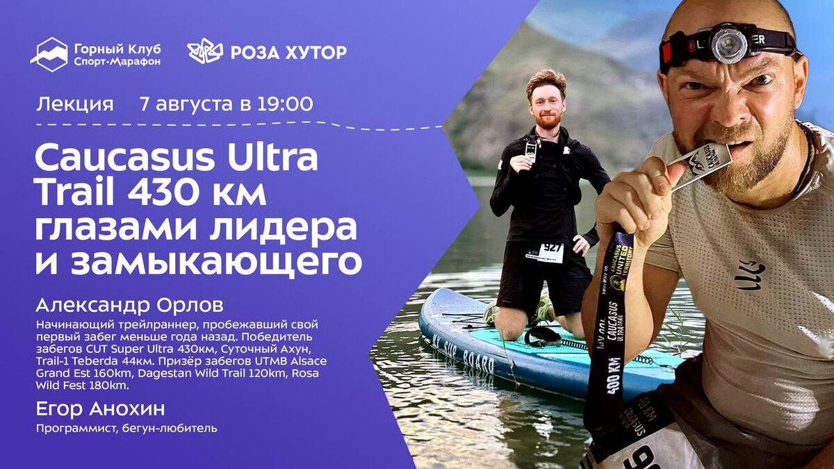 Расписание лектория Горного Клуба Спорт-Марафон: 📆7 августа (четверг) 🕑19:00 Caucasus Ultra Trail 430 км глазами лидера и замыкающего. Александр и Егор расскажут о подготовке, стратегии сна, питании, экипировке и о том, как прошел сам забег. 🗣АЛЕКСАНДР ОРЛОВ Начинающий трейлраннер, пробежавший свой первый забег меньше года назад. Победитель забегов CUT Super Ultra 430км, Суточный Ахун, Trail-1 Teberda 44км. Призёр забегов UTMB Alsace Grand Est 160km, Dagestan Wild Trail 120km, Rosa Wild Fest 180km. 🗣ЕГОР АНОХИН Программист, бегун-любитель. 📆8 августа (пятница) 🕑19:00 Просмотр фильма «Теберда» в Красной Поляне! Фильм «Теберда» — это взгляд изнутри на работу команды, разносторонняя история о горах Теберды, о спорте, дружбе и единстве, где каждая секунда на экране — результат общих усилий. А так же потрясающая природа Кавказа, завораживающие виды, горы и ущелья. ✅ Регистрация на сайте kpmountainclub.ru 📍 Горный Клуб Спорт-Марафон Роза Хутор, наб. Панорама, 4 (цокольный этаж оте