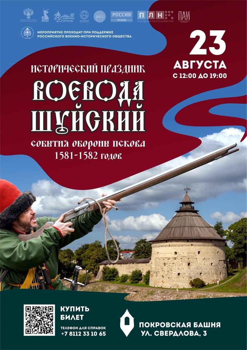 Праздник «Воевода Шуйский» 🛡 ⚔️ Вновь у Покровского угла будет разбит военный лагерь, и можно увидеть, как люди жили в XVI–XVII веках. Гостей ждут мастер-классы на любой вкус, зрелищные сражения реконструкторов, турниры и познавательные лекции. Организаторы мероприятия — Псковский музей-заповедник и Псковское региональное отделение Российского военно-исторического общества. 📆 23 августа (сб) в 12:00. 📍Покровский угол (ул. Свердлова, 3). 🎟 400 руб./чел. – взрослые, 250 руб./чел. – льготный билет, бесплатно – дети до 5 лет, военнослужащие, ветераны боевых действий. 📞 Дополнительная информация: +78112331065. Оставайтесь с нами #НашаПсковскаяобласть