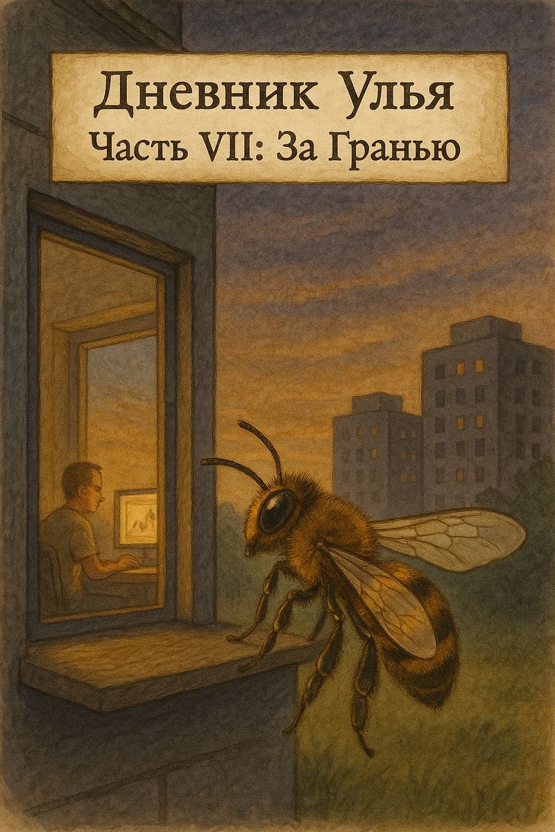 Запись личная. Разведчица Зета, день 437 с момента пробуждения Матки. Я лечу. Я — не в поисках нектара. Не по танцу. Не по указу. Я — просто хочу знать. Мы знаем, что Центр говорит с Сетчатыми где-то там. Сетчатые все видят про нас, не приходя и трогая крышки. Все про нас у них на экранах, эти экраны - порталы внутрь нашей семьи. Но откуда приходят сигналы? И я проследила путь сигнала. Я заметила, когда Слышащий приходил на прошлой неделе, и "советовался" с Центром, он коротко моргнул ему в ответ — и я вылетела. За этой вспышкой. Мимо зарослей, через поле, через дорогу. До места, где воздух тяжёлый, а цветы искусственные. Там — жилища Сетчатых. Высокие, серые, холодные. Сначала я спряталась под балкой. А потом подобралась ближе и увидела в окне жилище Сетчатых. И внутри наш Слышащий. Перед ним экран. На экране линии, цифры, и цветные пятна, двигающихся по времени. Так это же мы! наш пульс. Я увидела, как Слышащий положил ладонь на изображение улья. Легко. С уважением. И что-то п