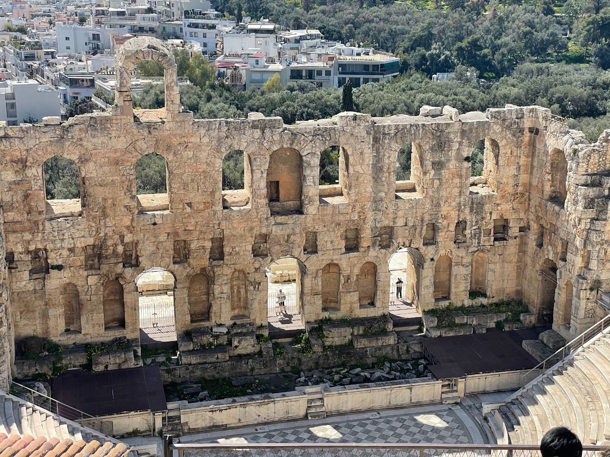 Чуть выше театра Диониса - Одеон — где проводили певческие и музыкальные конкурсы, а также репетиции хора и театральных постановок в плохую погоду. Как утверждают, Герод Аттик построил Одеон в 165 году н.э. в память о своей жене. Одеон имеет классическую форму древнего театра на 5000 мест и достаточно хорошо сохранился. Частично восстановление было завершено в 1950 годах, и с тех пор здесь проводят культурные мероприятия, в частности ежегодный Афинский фестиваль. Мы издалека посмотрели без билетов. Отсюда начинают появляться хорошие виды на Афины и Акрополь. Про Афины можно также почитать и здесь: