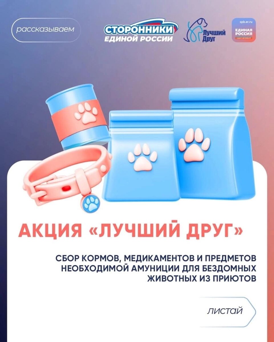 Акция "ЛУЧШИЙ ДРУГ" 🎁 Благодаря участвующим в акции Петербуржцам удаётся передать в специализированные учреждения сотни килограммов кормов, вет.препаратов, лекарства, поводков и других полезных вещей для ухода за животными. Присоединиться к акции может каждый! Как это сделать, что принести, а также сколько у Вас на это есть времени, рассказывается в карточках. Место сбора - Администраторы ГБУ ДО СШОР Пушкинского района Санкт-Петербурга, временные рамки - по 7 августа (четверг) включительно. Давайте поддержим малюток 🐈 необходимым вместе❗️