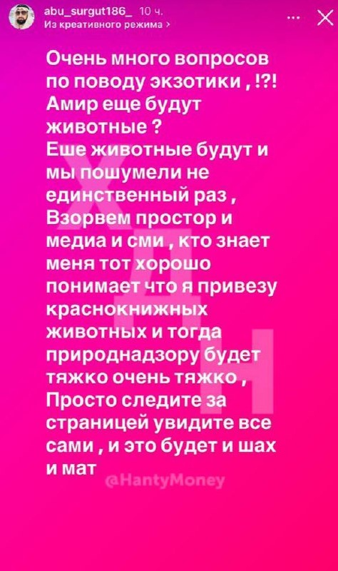 😳 Сургутский блогер, у которого изъяли льва, грозится завести нового питомца из Красной книги «Кто знает меня, тот хорошо понимает, что я привезу краснокнижных животных, и тогда Росприроднадзору будет очень тяжко. Увидите все сами — это будет шах и мат», — сообщил Магомедов в соцсетях. В разговоре с нами блогер отказался уточнять, кого именно собирается привезти. «Пусть это останется секретом, но такого животного в Югре нет», — сказал он. 📷Instagram (запрещен в РФ, принадлежит экстремистcкой Meta) / abu_surgut186_ Подписаться | Прислать новость | Дать «буст»