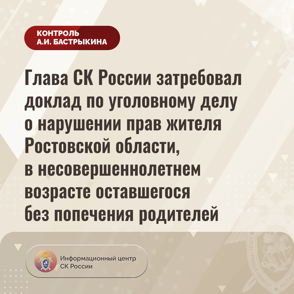 Глава СК России затребовал доклад по уголовному делу о нарушении прав жителя Ростовской области, в несовершеннолетнем возрасте оставшегося без попечения родителей К Председателю СК России А.И. Бастрыкину через Информационный центр обратился житель Ростовской области, в несовершеннолетнем возрасте оставшийся без попечения родителей. На протяжении нескольких лет мужчина обращался в компетентные органы с заявлением о постановке его на учет лиц, подлежащих обеспечению жилплощадью, однако получал необоснованные отказы. В результате заявитель вынужден арендовать жилье за счет собственных средств. В СУ СК России по Ростовской области по данному факту расследуется уголовное дело, возбужденное по поручению А.И. Бастрыкина. Председатель Следственного комитета Российской Федерации Александр Иванович Бастрыкин затребовал у руководителя СУ СК России по Ростовской области Аслана Гаруновича Хуаде доклад о предварительных и окончательных результатах расследования уголовного дела. Исполнение поручения