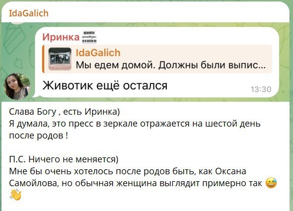 "Очень хотелось после родов быть как Оксана Самойлова, но обычная женщина выглядит примерно так": Ида Галич ответила неделикатной подписчице, которая раскритиковала фигуру блогерши после родов🔥 Фото и видео: GALICH_onok/Telegram Spletnik