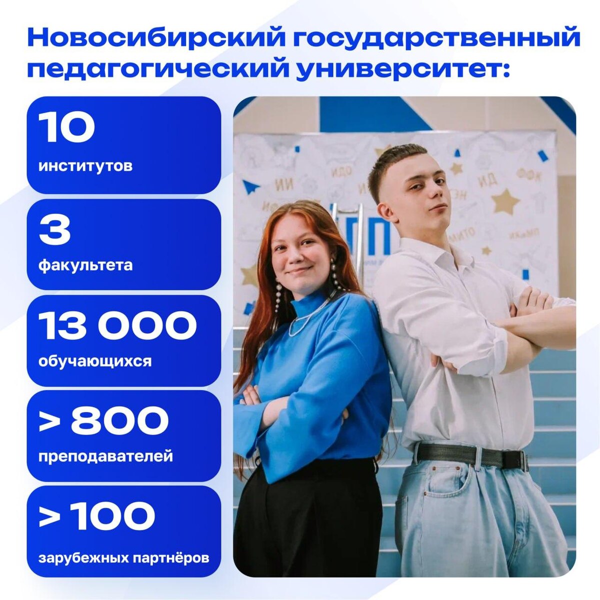 Новосибирский государственный педагогический университет — драйвер научно-исследовательской работы в сфере педагогики, психологии, воспитания, улучшения качества преподавания естественно-научных дисциплин. НГПУ располагает современной инфраструктурой: в вузе созданы и эффективно работают педагогический технопарк «Кванториум» им. Ю.Б. Румера и Технопарк универсальных педагогических компетенций им. Ю.В. Кондратюка. Студенты и школьники воплощают самые смелые замыслы — от естественно-научных разработок до программирования и искусственного интеллекта. Наряду с РГПУ им. А.И. Герцена и МПГУ вуз вошёл в число лидеров по числу поданных на бюджет заявлений. ✅ Какие новые направления подготовки открылись для будущих студентов Новосибирского педагогического и как живёт вуз — читайте в карточках.