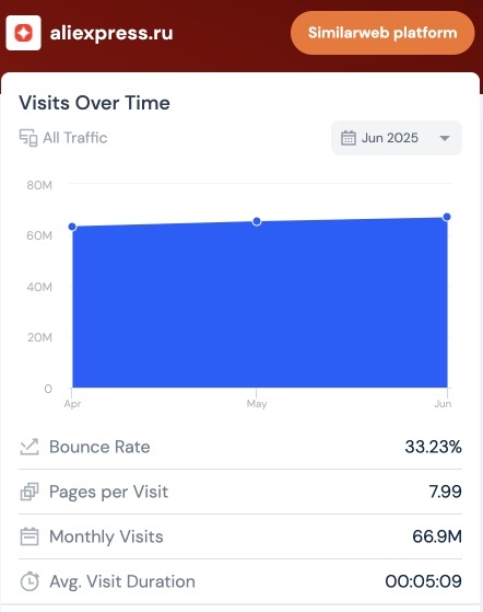 AliExpress, являясь одной из крупнейших мировых платформ электронной коммерции, имеет значительное количество пользователей в России и странах СНГ. Согласно последним данным, AliExpress является самым популярным сайтом для шопинга в России, что подтверждается его высокими показателями посещаемости и вовлеченности пользователей. Как видно на фото, примерная оценка 67 миллионов человек в месяц посещают Алиэкспресс Россия. В июне 2025 года AliExpress зафиксировал 66.9 миллионов посещений в месяц. Основные показатели вовлеченности включают: Эти данные свидетельствуют о высокой вовлеченности пользователей, которые проводят значительное количество времени на сайте и просматривают множество страниц за один визит. Основная доля пользователей AliExpress приходится на Россию, что составляет 87.35% от общего числа посещений. Другие страны СНГ также вносят свой вклад в общую посещаемость: Эти данные показывают, что AliExpress пользуется большой популярностью не только в России, но и в других стра
