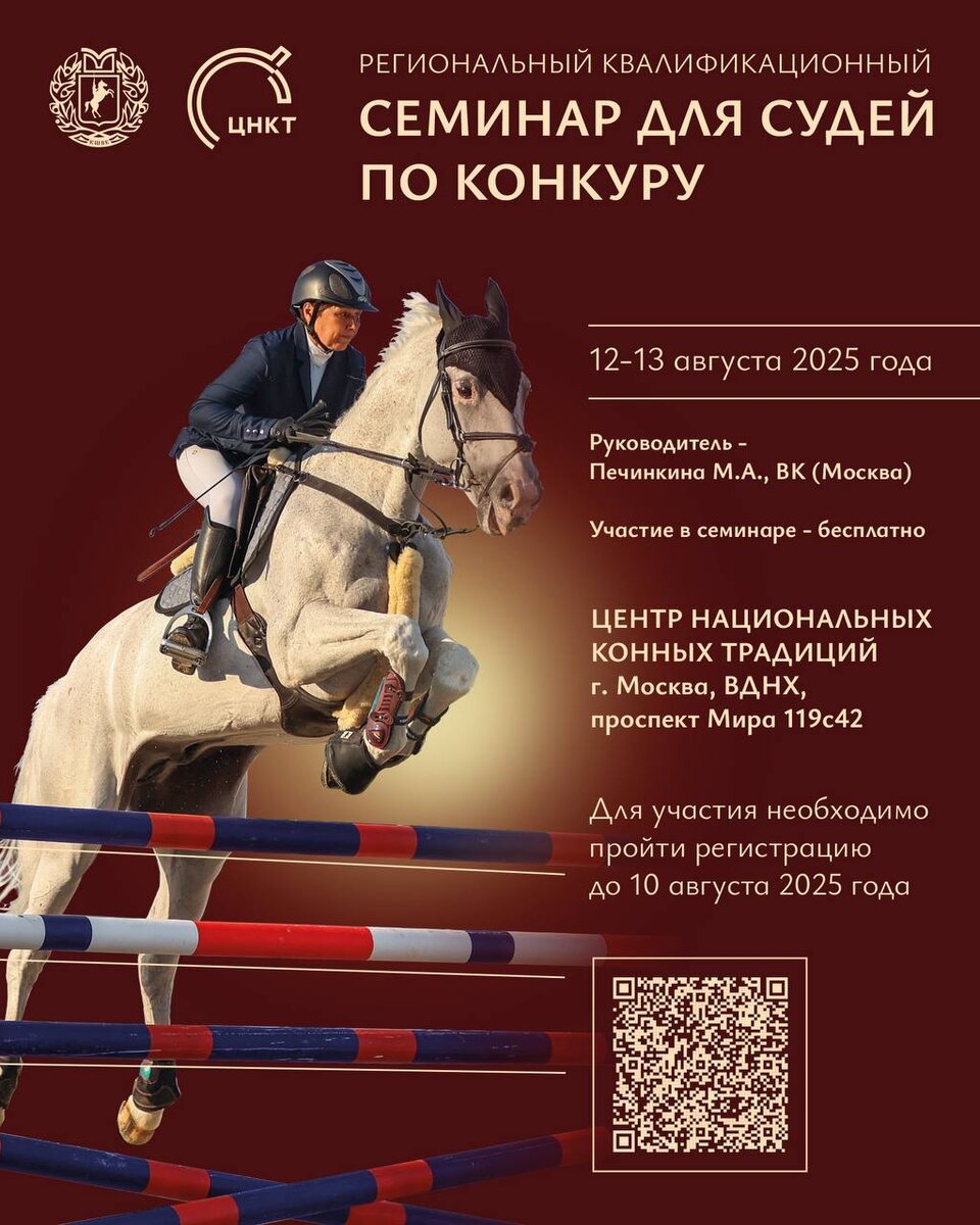 12 и 13 августа в Центре национальных конных традиций на ВДНХ состоится Региональный квалификационный семинар для судей по конкуру Данный семинар дает возможность в числе первых ознакомиться с нововведениями в судействе конкура, повысить квалификацию специалистов, разобрать и обсудить общие практические вопросы, а также пройти тестирование с последующим повышением или подтверждением категории. Ознакомиться с условиями участия и порядком проведения семинара можно 👉🏻здесь Участие в семинаре - бесплатно Регистрация доступна до 10 августа (включительно) по →ссылке