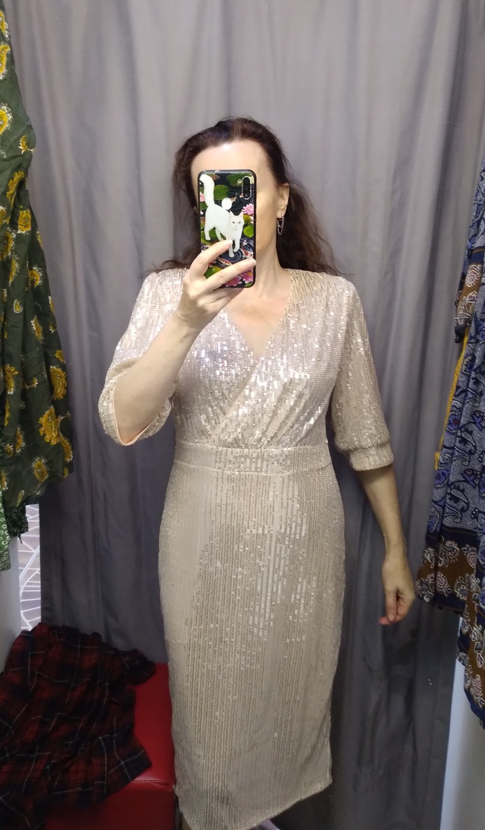 Здравствуйте, иногда надо, иногда просто необходимо померить платье. Можно прекрасно отдавать себе отчёт, что в ближайшие лет 100 мне оно не понадобится, но очень надо померить)). Нарядное платье как ни удивительно на мой рост, рукава 3/4 и запах на груди, на ладонь ниже коленей. Есть подкладка и молния на спинке, которая мне не пригодилась, из-за запаха можно так проскочить.)) Жёсткие пайетки, ни одна не замялась, всё на месте. Красивое, переливается, тяжелое, но это только плюс. Пайетки нашиты на легкую сетку, а подкладка тяжелая и плотная, очень хорошо повторяет изгибы фигуры. Красота)). А теперь к обуви и сумками, всё можно было купить со скидкой 50%. Цены пишу полные. Короткие белоснежные кеды с золотистым кантом. Похоже, что новые. Около 2 тыс. Шлепки на толстой подошве, массивные, но легкие. Если не ошибаюсь, то их можно назвать пантолетами. Туфельки Мери Джейн, ремень украшен мелкими металлическими заклепками. По моему я их раньше видела еще на скидке 80%. Лодочки светлого