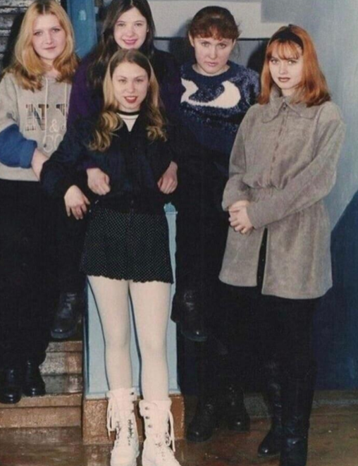 Ступени панельной девятиэтажки. Три девушки позируют перед камерой — кто-то куртке, кто-то в коротких платьях. Колготки с затяжками, туфли на невысоком каблуке. Макияж нанесен плотно — тональный крем, яркая помада, подведенные глаза.