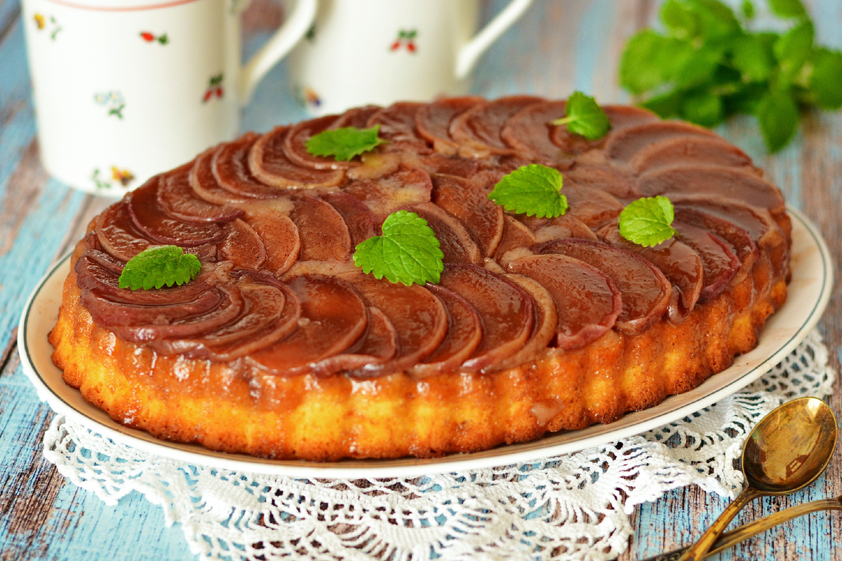 После выпечки даём постоять 10–15 минут. Затем аккуратно переворачиваем на плоскую тарелку. Персики окажутся сверху – глянцевые, с карамельным блеском.