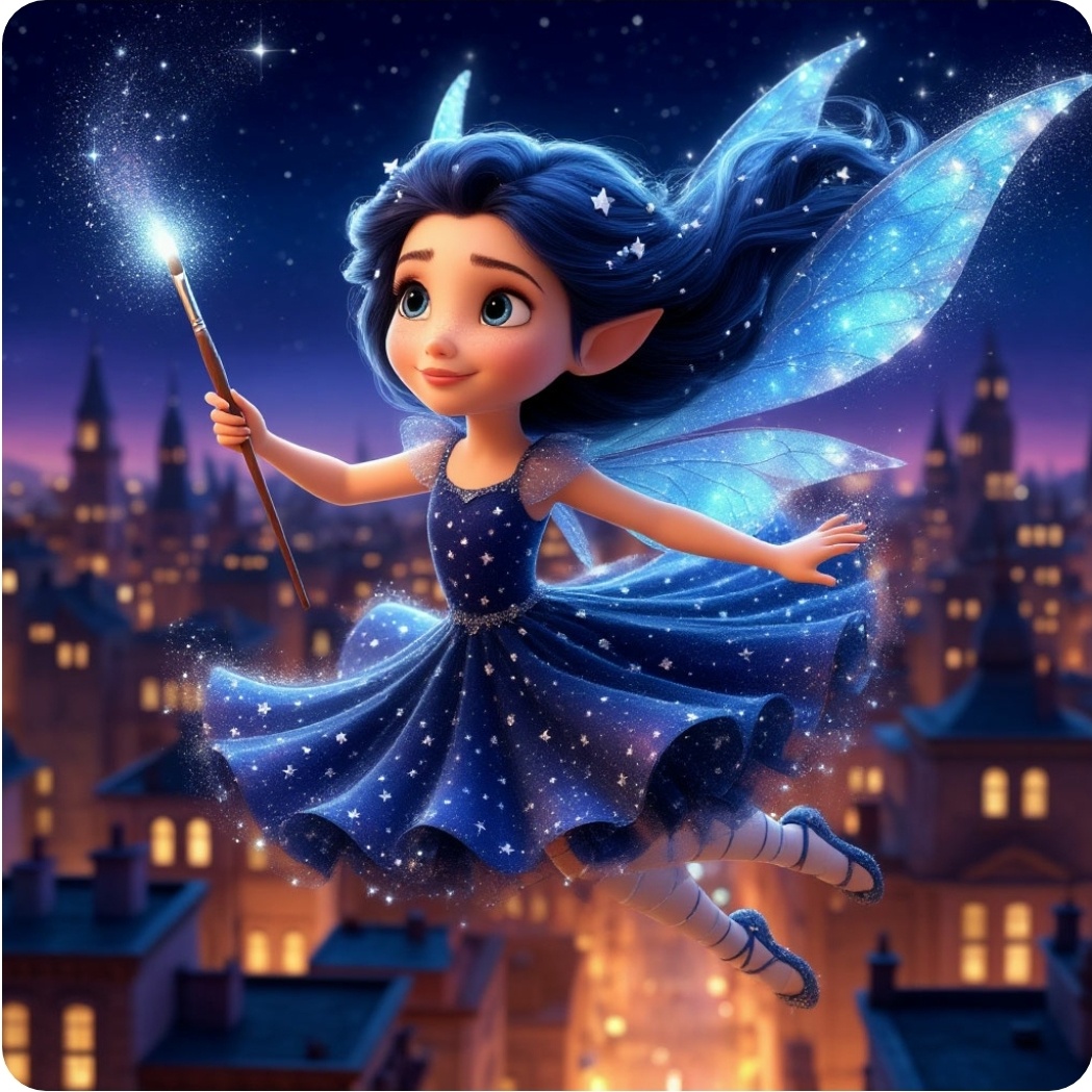 В краю, где реки света струились меж холмов, а небо было вечным полотном для закатов и зорь, жила Эльмира, Фея Росписных Снов. Волосы ее были как ночное небо, темно-синие, усыпанные серебристыми искорками, будто кто-то рассыпал по ним звездную пыль. Платье ее было легче паутинки и постоянно меняло узоры: то горошек лиловый, то золотые полоски, то вдруг расцветали целые созвездия. В руке она всегда держала свою волшебную кисть с перламутровой ручкой, а на крошечной палитре у нее на ладони сами собой рождались и перетекали краски невиданных оттенков: цвет смеха ребенка, оттенок первого луча солнца, синева чистейшего горного льда.