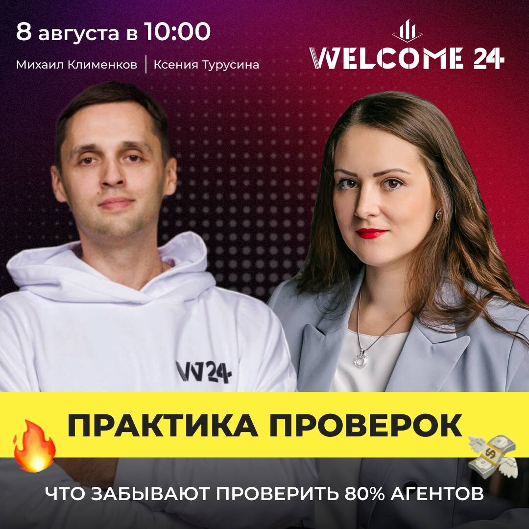 Вебинар, который может спасти ваши сделки🔥 Ошибки при совершении сделок — это не только лишние нервы, но и репутация 😱 В эту пятницу мы в эфире разберём, что забывают проверить 80% агентов 📆 Когда: 8.08 (пятница), 10:00 по МСК 📍Где: в нашем Telegram-канале О чём поговорим: ✅ Что именно чаще всего упускают при проверке объекта и продавца ✅ Алгоритм действий, который защитит и клиента, и вас ✅ Кейсы из практики: реальные ошибки агентов и чем это чревато 🗣️Спикеры: — Ксения Турусина — юрист с 13-летним стажем, сооснователь Центра правовой поддержки риэлторов — Михаил Клименков — CEO WELCOME 24 Переходите в телеграм-канал Ксении, чтобы быть всегда в курсе всех юридических изменений 🔥 Отметьте в календаре и поставьте напоминание, чтобы не пропустить 🔔