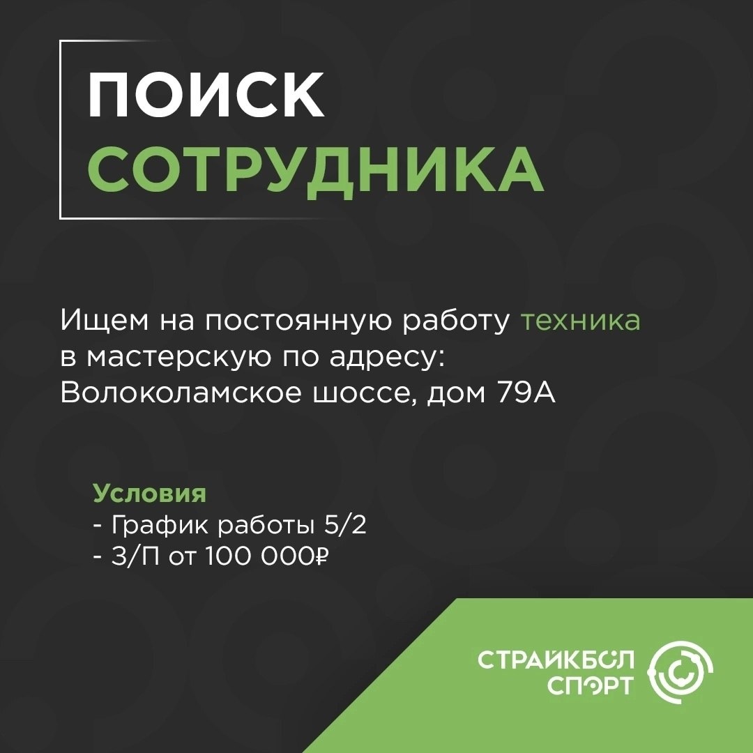 Друзья! В наш замечательный коллектив требуется техник в страйкбольную мастерскую. ‼️Вакансия актуальна для г. Москва‼️ 📌 Мы предлагаем: — Официальное трудоустройство — Стабильную заработную плату от 100 тысяч рублей в месяц после испытательного срока — График работы 5/2 — Карьерный рост — Дружный коллектив, разделяющий ваше увлечение, который всегда подскажет и поможет ‼️ Обращаем внимание, мы ищем кандидата на полный рабочий день с 10:00 до 18:00 ‼️ 📌 От Вас мы ждём: — Знание принципов работы страйкбольного оружия (AEG, GBB, Spring), а также опыт ремонта и технического обслуживания обязательны. Навки работы с ВВД будут преимуществом. — Навыки работы с компьютером (необходимо для ведения отчетности) — Умение грамотно разговаривать с клиентами — Опрятный внешний вид — Не студент(ка) — Желание развиваться, целеустремленность, коммуникабельность, исполнительность 📌 Что предстоит делать: — Ремонтировать и проводить ТО страйкбольного оружия — Вести отчетность — Консультировать клие