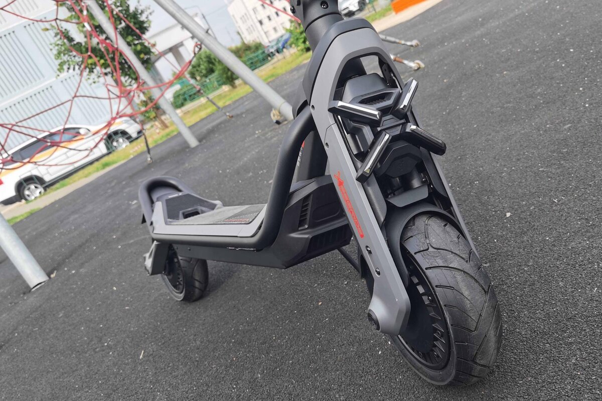 Металлические детали самоката покрыты устойчивой к истиранию черной порошковой краской, пластиковые детали выполнены в черном и сером цветах. Всё в дизайне говорит о скорости и мощности: изгиб рамы, увеличенный наклон рулевой стойки, приподнятое заднее крыло, пластиковая накладка на вилку, центральный рефлектор, форма элементов управления на руле, яркие красные акценты. Качество сборки отличное: сварные швы выполнены аккуратно, люфты отсутствуют. Производитель также заявляет о проведении более 180 тестов и 5000 км дорожных испытаний, результаты которых и позволили предоставить увеличенную гарантию.