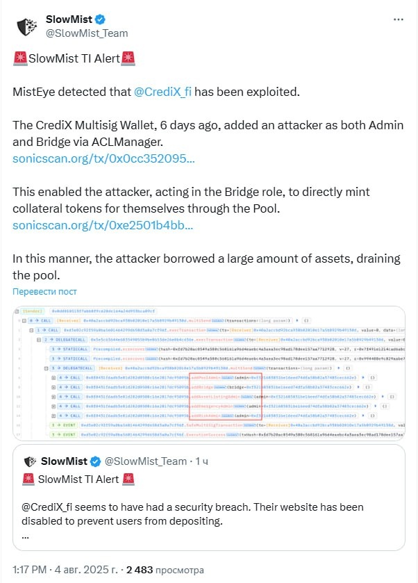 🏳️🌈 По данным SlowMist, DeFi-проект CrediX подвергся атаке после того, как шесть дней назад злоумышленник был добавлен в качестве