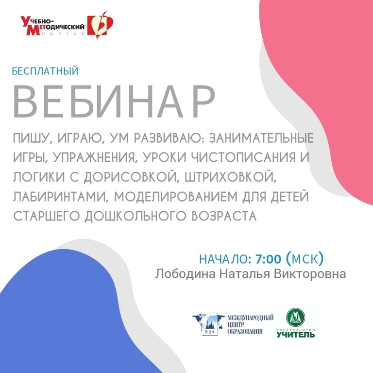 Вебинар «Пишу, играю, ум развиваю: занимательные игры, упражнения, уроки чистописания и логики с дорисовкой, штриховкой, лабиринтами, моделированием для детей старшего дошкольного возраста» Дата проведения: 05.08.2025 Начало: 7:00 (МСК) https://www.uchmet.ru/events/item/3895398/ На вебинаре слушатели вместе с ведущим рассмотрят основные закономерности развития навыков письма и логического мышления в дошкольном возрасте, а также познакомятся с развивающими играми, заданиями, методиками и упражнениями по формированию каллиграфического письма и интеллектуальных способностей у дошкольников. Содержательные вопросы вебинара: 1. Закономерности развития навыков письма и мышления в дошкольном возрасте. 2. Логическое мышление в старшем дошкольном возрасте. 3. Методические приемы обучения каллиграфическим навыкам письма. 4. Комплекс заданий и упражнений, направленных на формирование каллиграфического письма у дошкольников. 5. Решение элементарных интеллектуальных задач «Гимнастика ума». 6. Наг