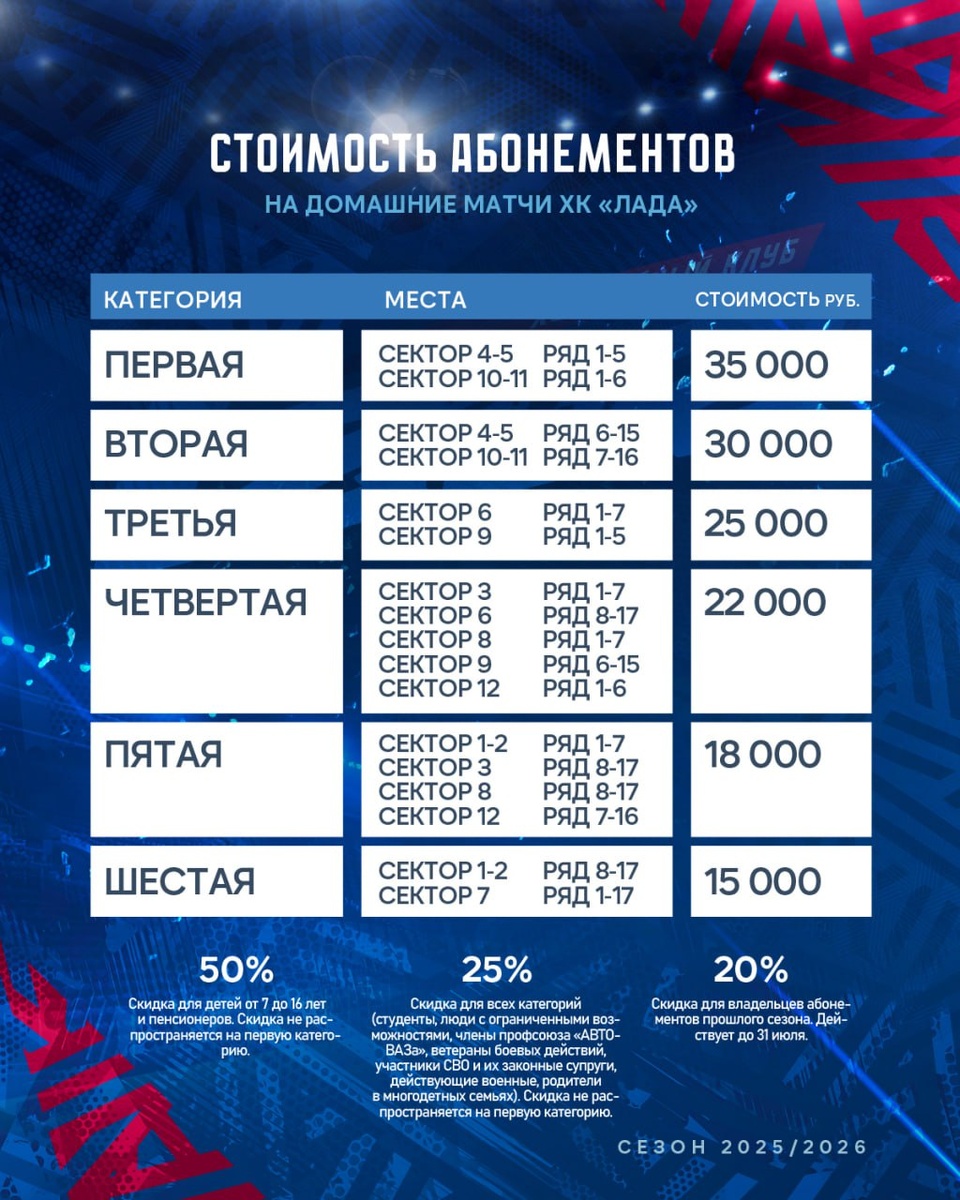 Самые дешевые абонементы на «Ладу» начинаются от 15 000 рублей (в прошлом сезоне 12 тысяч), а самые лучшие места на весь сезон стоят 35 000 рублей (было 30 тысяч). Плюс есть различные скидки для разных категорий населения, включая прошлогодних обладателей абонементов.