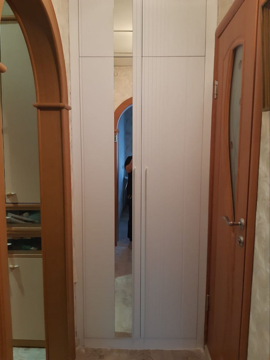 Бюджетный распашной шкаф, идеально вписывающийся в нишу вместо старого советского варианта — это современный комфорт и функциональность, доступные каждому! Наша компания легко справилась с поставленной задачей. Ширина 934мм, высота 2557мм, глубина 450мм Материалы: • ЛДСП Белый шагрень 16мм • Фасады МДФ 19мм с фрезеровкой и зеркалом • Ручки Ручка EXTEND L-1200 мм, белый Стекло наклеено на МДФ Отзыв клиента очень приятен: Добрый день! Благодарю за отличный сервис и качество компанию Купе. Во -первых, было очень приятно работать с Никитой, очень грамотный специалист, понимает клиента с полуслова. Диалог выстроен отлично, всегда на связи. Во- вторых доставка, сборка быстрая и качественная, никаких нареканий, шкаф без изъяна. Плечики в шкаф глубиной 433 вошли и даже дверь закрывается полностью, по рекомендации конструкторов и менеджера-Никиты, заказала плечики поменьше. Спасибо. Даже скромный по размерам новый шкаф способен преобразить привычное пространство, наполнив его свежесть