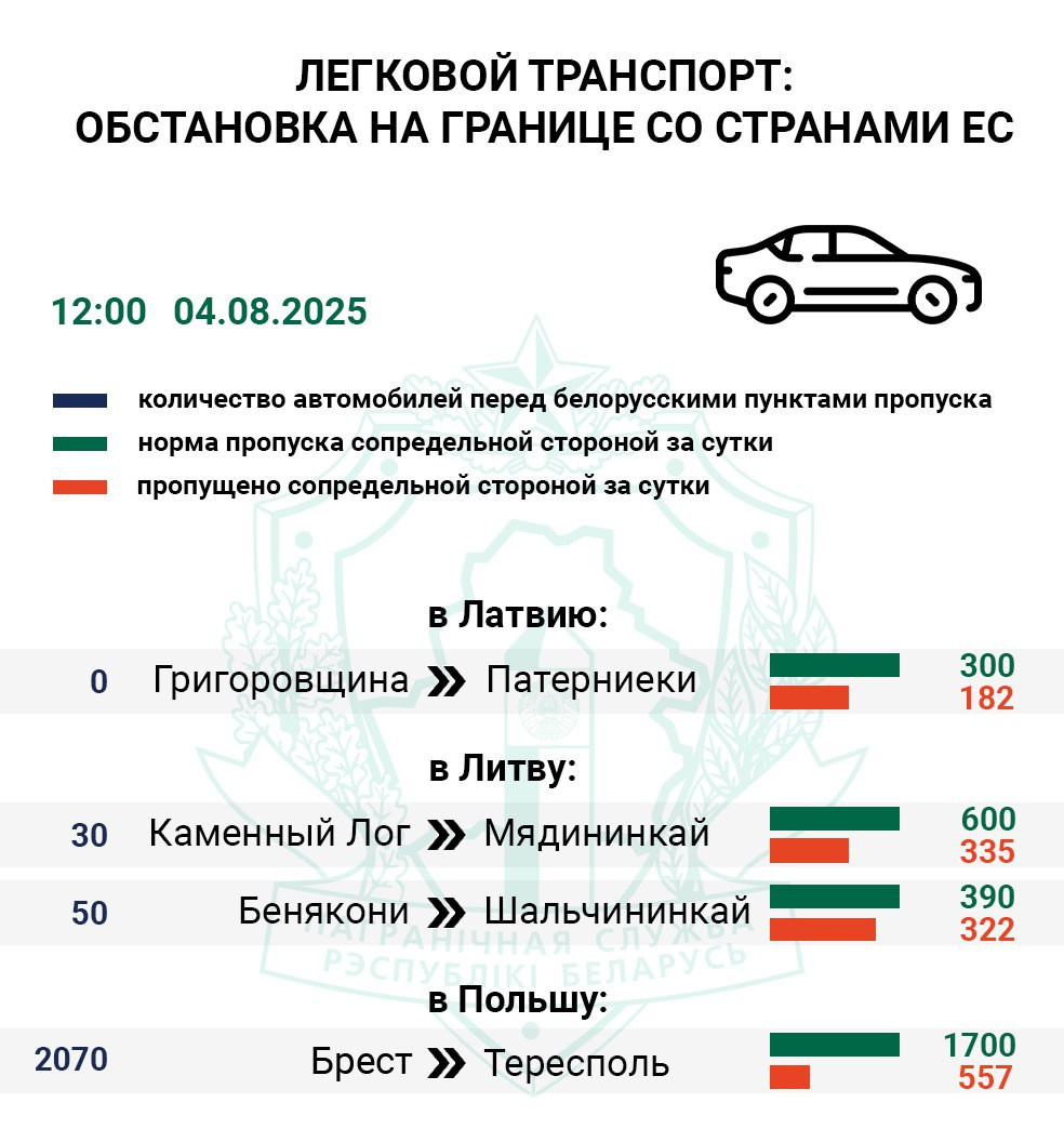 На границе Беларуси и Польши в настоящее время действует лишь один пункт пропуска, где можно проехать на легковом автомобиле: «Брест» — с белорусской стороны, «Тересполь» — с польской. Ситуация там не бывает простой, но сейчас она усугубилась. — Если после предыдущих выходных очередь из легковушек, ожидающих выезда в Польшу, составляла в среднем 1000 автомобилей, то после этих — превышает 2000, — предупреждает Государственный таможенный комитет. — После регистрации в электронной очереди водителям приходится ожидать вызова в пункт пропуска «Брест» более 3 суток. — Неритмичность приема польскими контролирующими службами прибывающих из Беларуси авто только нарастает. Лишь 30% от возможного количества оформила польская сторона за предыдущие сутки. Такая картина наблюдается последние три дня, в то время как количество выезжающих в этом направлении транспортных средств увеличивается, — отмечают в таможенных органах. — Что касается времени, затрачиваемого на таможенный контроль непосредственн