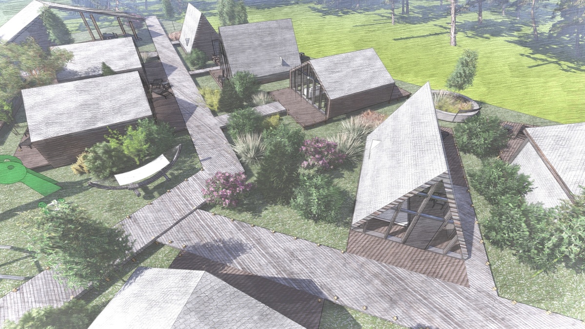Парк-отель в стиле глемпинга: уникальный отдых на природе В последние годы глемпинг — уникальное сочетание кемпинга и роскоши — завоевывает все большую популярность среди любителей природы и комфорта. Наша архитектурная студия рада представить концепцию нового парк-отеля, который позволит вам насладиться отдыхом в окружении живописной природы, не отказываясь от удобств и современных технологий. ▎Уникальные номера — отдельные здания Каждый номер нашего парк-отеля представляет собой отдельное одноэтажное здание, выполненное в современном стиле. Просторные панорамные окна обеспечивают великолепный вид на окружающий ландшафт, а большая терраса станет идеальным местом для утреннего кофе или вечернего отдыха под звездами. Внутри номера вы найдете все необходимое для комфортного проживания, включая стальную сантехнику и современные удобства. ▎Центральное здание: уют и комфорт На территории парк-отеля расположено центральное здание, где находятся рецепция, ресторан и небольшая зона спа. Здесь
