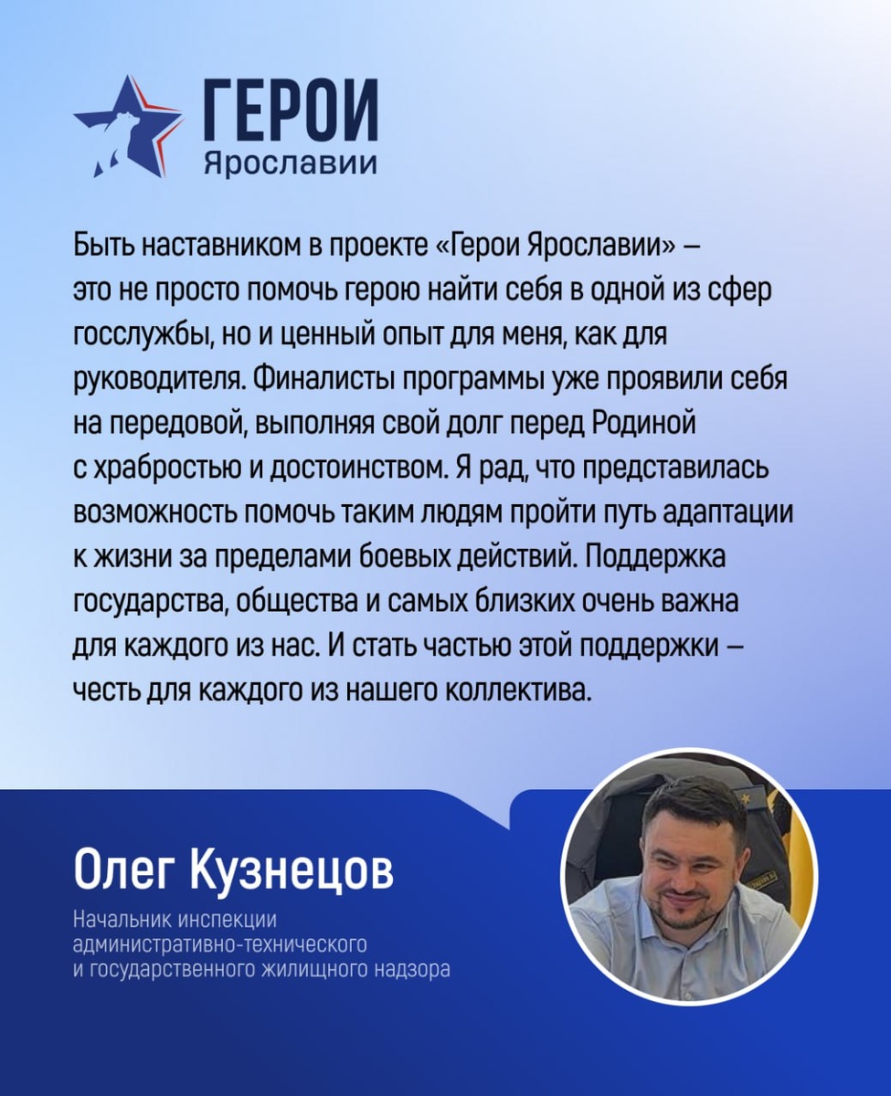 Участники программы «Герои Ярославии» знакомятся со своими наставниками Бойцы СВО вместе со своими кураторами определяют план развития как в профессии, так и в личностном росте. Наставники помогут сориентироваться, поделятся опытом и поддержат своих подопечных поддерживают в процессе обучения и стажировок. На первый поток программы было подано около 300 заявок, до финала дошли 34 человека. Почти у всех высшее образование, у некоторых — есть даже несколько дипломов. Проект «Герои Ярославии» — региональный аналог федеральной программы «Время героев». Его цель — помочь бойцам адаптироваться к мирной жизни, раскрыть свой потенциал и закрепиться в профессии.
