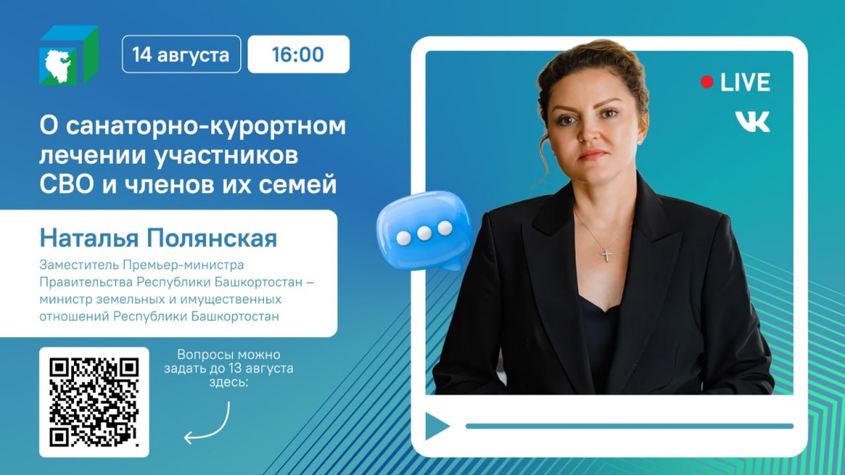 Республика Башкортостан – один из первых регионов России, запустивших программу реабилитации военнослужащих и оздоровления членов их семей. Участники СВО и их близкие могут получить бесплатное санаторно-курортное лечение. Подробности о порядке организации лечения расскажет в прямом эфире из ЦУР Башкортостана заместитель Премьер-министра Правительства Башкортостана – министр земельных и имущественных отношений республики Наталья Полянская. Смотрите эфир 14 августа в 16:00. Оставляйте свои вопросы с 4 по 13 августа на Платформе обратной связи «Госуслуги. Решаем вместе» https://pos.gosuslugi.ru/lkp/direct-line/9382/ 💚 ЦУР Башкортостана