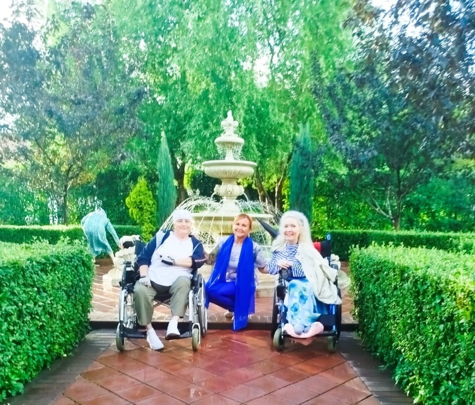 Складывать зонтики не хотелось. А вдруг опять дождь? А ехать с зонтом неудобно, зонт над моей головой закрывает обзор перед собой. Как ни устанавливай зонт за спиной, а он сваливается в бок! В этот момент к нам подошла девушка и попыталась помочь, слово за слово, оказалось, что нам по пути и мы так и шли вместе в парк САДЫ МЕЧТЫ в красивейшую достопримечательность Красноярска. После дождичка в субботу случилось ещё одно чудо! Казалось, Боженька послал нам ангела в человеческом обличии, который помогал нам на нашем пути во всём, что мы делали и куда мы ни следовали. На входе в парк красоты и декора мы сообщили, что наша попутчица - НАША сопровождающая и мы зашли втроём бесплатно (инвалид и сопровождающий в САДАХ МЕЧТЫ бесплатно, а вообще-то вход стоит 500 рублей), и, так мы и гуляли весь вечер, болтая обо всём на свете, смеясь и фотографируясь, так, словно, мы закадычные подружки, на одной волне и знакомы всю жизнь! Было весело всем! Вечер удался и этот день никогда не забыть, и дай Бо