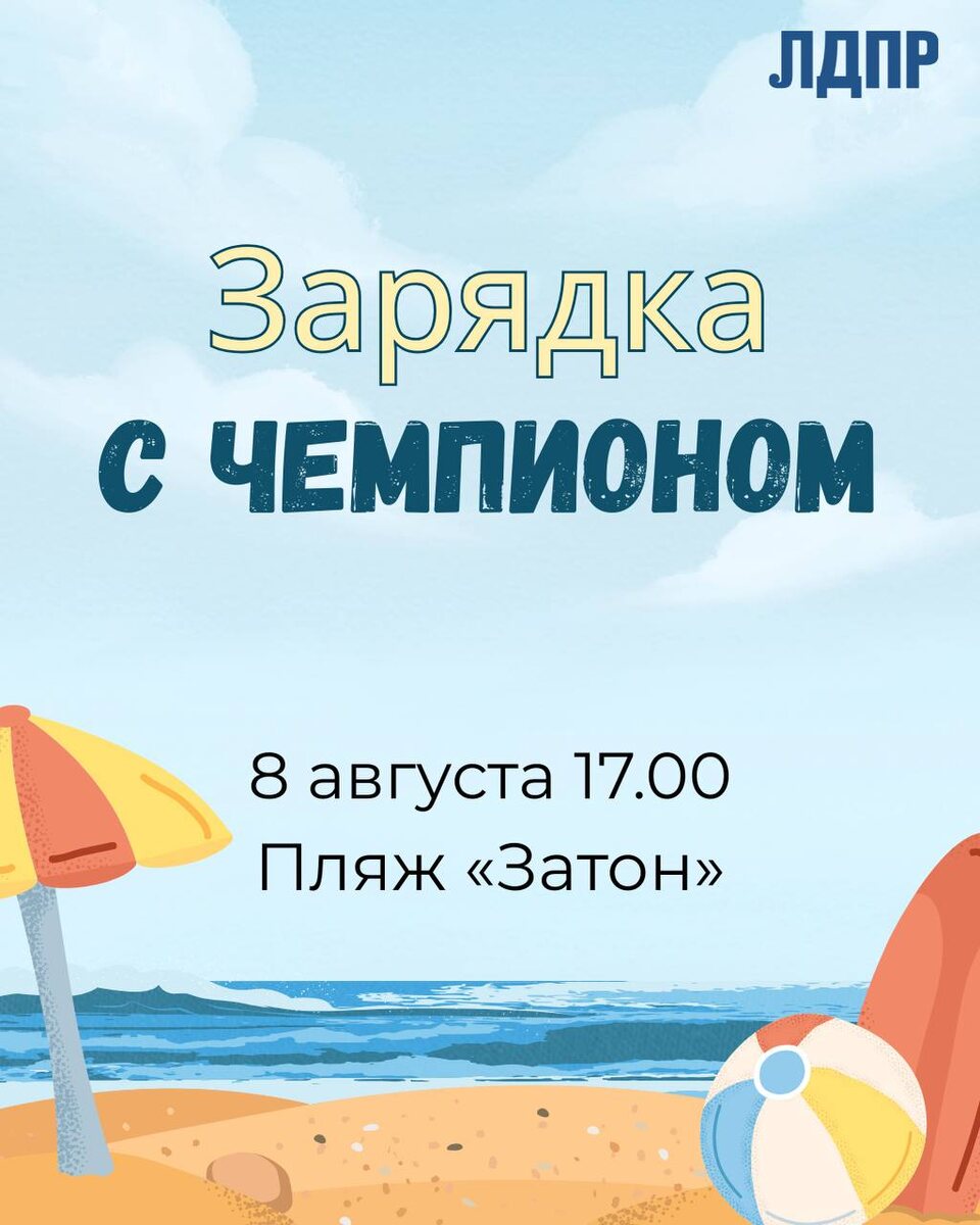 🏃♀️Присоединяйтесь к зарядке с чемпионкой на пляже в Затоне! В честь дня физкультурника тренер Саратовской школы олимпийского резерва по дзюдо «Сокол», мастер спорта международного класса, чемпионка России и Европы Екатерина Мельникова проведет зарядку для всех желающих. 📆Когда? 8 августа в 17.00 📍Где? Пляж «Затон» Участие абсолютно бесплатное, планируются призы за активность от ЛДПР. Приходи сам и бери с собой друга — проведите время с пользой для тела и духа! 💬 Мы ВКонтакте 🖥 Сайт ЛДПР | Саратов