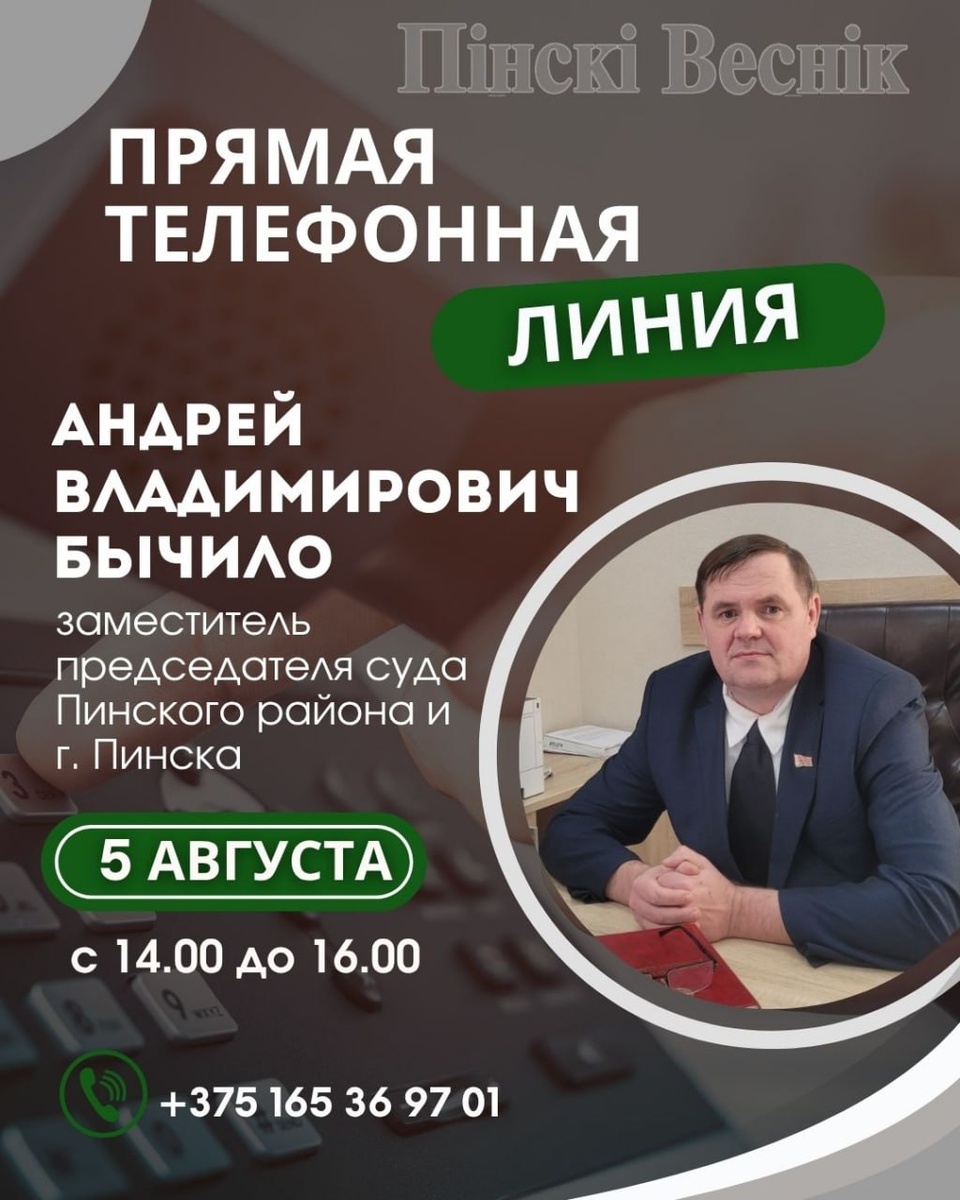 🤍5 августа 2025 года с 14.00 до 16.00 часов состоится прямая телефонная линия с заместителем председателя суда Пинского района и г. Пинска Андреем Владимировичем Бычило.