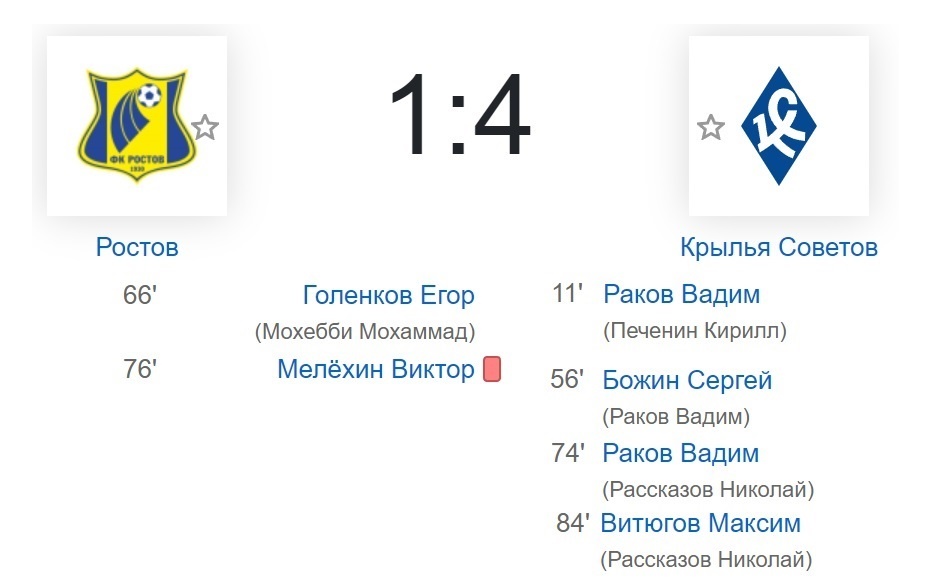 В российской премьер-лиге завершился 3-й тур. Рассказываю о результатах, расписании и таблице. Ростов в родных стенах крупно уступил Крыльям Советов – 1:4. В составе самарцев дублем отметился Ракова. Сергей Божин и Максим Витюгов записали по голу. У хозяев забитый мяч на счету Егора Голенкова. «Крылья Советов» набрали семь баллов и вышли на первое место в турнирной таблице. В активе «Ростова» - 0 очков.