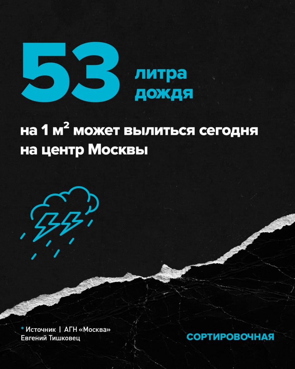 🌧 На Москву обрушится 53 литра дождя на квадратный метр Сегодня на центр Москвы выльется 53 литра дождя на квадратный метр. Об этом сообщил ведущий специалист центра погоды «Фобос» Евгений Тишковец. Низинные районы может подтопить. О причинах таких дождей в Москве рассказывали в посте. Подписаться на Сортировочную👍