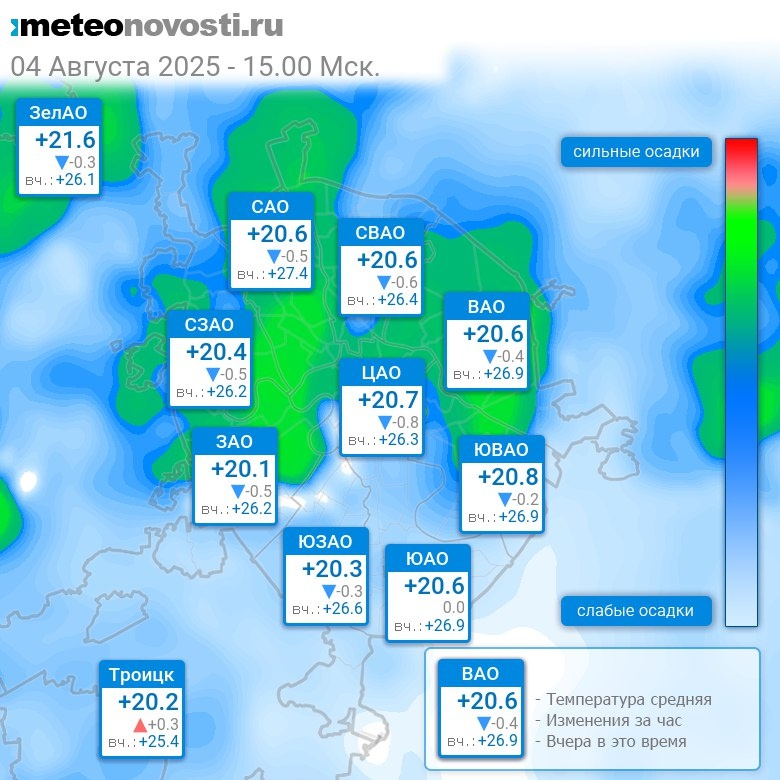 В 15:00 в Москве было от +19.4°C до +21.2°C, средняя температура +20.5°C #погода #Москва #лето #температура #4августа #понедельник