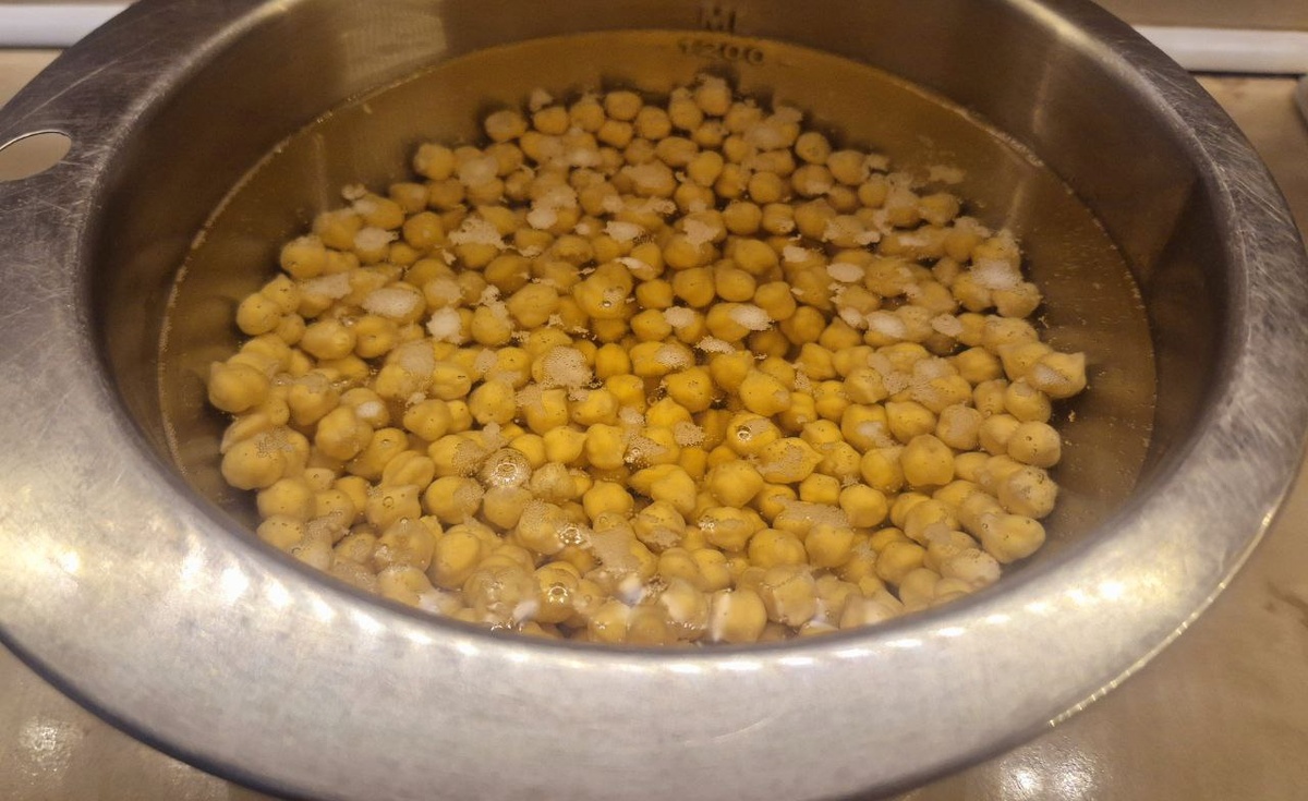 • Необходимо аранее приготовить нут. Залить нут водой на ночь. На следующий день слить воду и тщательно промыть. Подготовленный нут поместить в глубокую кастрюлю, залить водой, чтобы она покрывала нут на 3-4 см и варить до готовности примерно 80-90 минут. После оставить нут постоять ещё минут 10-15 в кастрюле с водой. Откинуть нут на дуршлаг, чтобы стекла лишняя жидкость.