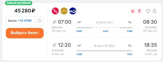 ✈️Москва - Коломбо (Шри-Ланка), туда одна пересадка, обратно прямой, от 45300 рублей 22 сентября - 5 октября - https://checkintime.ru/2oh7 🏖 Поиск туров | ✈️Авиабилеты