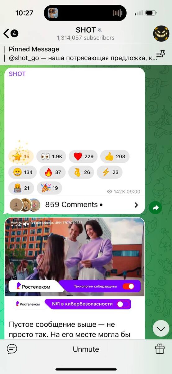 В крупных Телеграм-каналах вышли абсолютно пустые… посты. Объясняем: всё в порядке (админы не ошиблись), это креатив от Ростелекома. Так компания решила рассказать про собственные новые сервисы, которые оберегают пользователя в Сети. Мол, здесь могла быть новость про скам, но всё обошлось. хотим видеть только такие посты с тасками 🙉