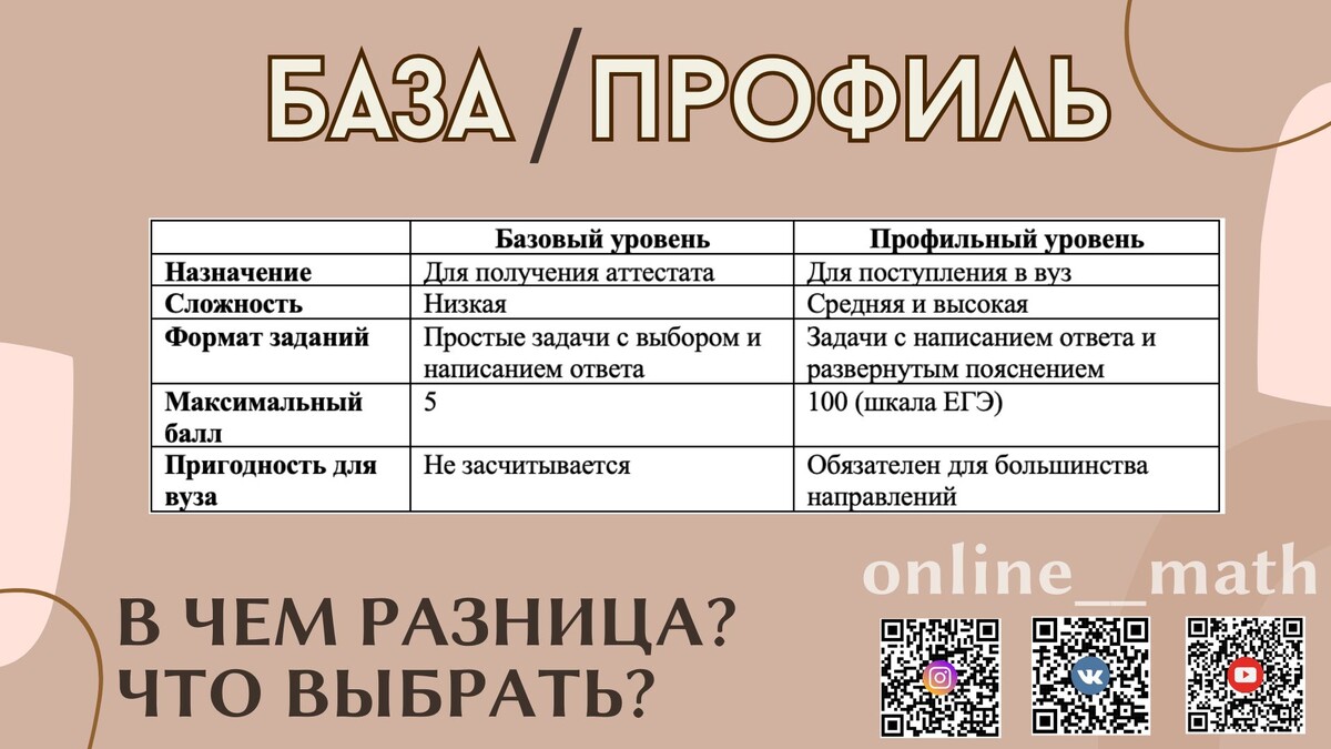 — Математика мне в целом даётся сложно. Не уверена, что справлюсь с профилем. Такой ответ — не редкость. Но при выборе уровня важно помнить: это не просто про «легче» или «сложнее». Это про то, какие возможности вы хотите иметь после школы. С 2015 года математика в ЕГЭ делится на 2 уровня: Да, напрямую. 🔸 БАЗУ сдают, если: — нет в планах поступать в вуз;