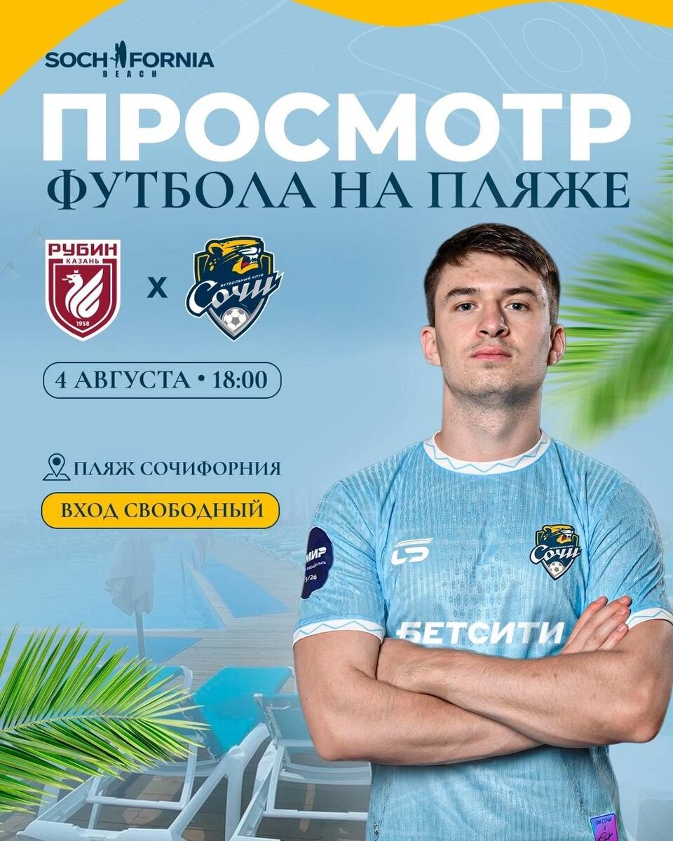 ФК «Сочи» приглашает болельщиков на просмотр выездного футбольного матча: Рубин - Сочи! 4 августа на пляже Сочифорния пройдет масштабное футбольное событие, организованное при поддержке нашего клуба 💪 В программе: 18:00 - 20.00: 🖌️Автограф-сессия с лучшим бомбардиром прошло сезона Павлом Мелёшиным ⚽ Турнир по футволей – любители активного отдыха смогут принять участие в захватывающей игре на песке и выиграть ценные призы от клуба 🎶 DJ-сет и яркое музыкальное сопровождение 🍹Бар и напитки от Сочифорнии 📸 Фото-сет с маскотом Барсиком 20:00 - 22.00: 📺 Прямая трансляция матча «Рубин» – «Сочи» , Болеем за наших! 🏆 Подарки и розыгрыши от клуба Адрес: ФТ Сириус ул. Голубая 16б пляжный комплекс «SOCHIFORNIA» (парковка бесплатная) Вход свободный Приходите поддержать команду! Это Сочи - Я и ты!