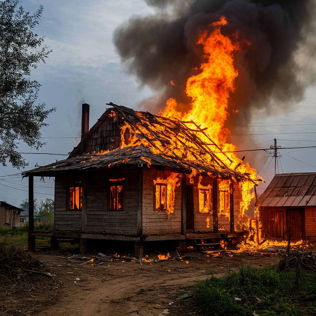 Первые языки пламени, тонкие и неуверенные, лизнули черепицу, будто проверяя её на прочность. Но это была лишь прелюдия к разверзшейся стихии. Огонь мгновенно охватил стропила, вгрызаясь в дерево с ненасытной жадностью. Через считанные секунды огненные языки вырвались из окон, они, словно руки, тянулись к небу, жадно глотая кислород и извергая клубы густого, черного дыма. Дым, напитанный едкими продуктами горения, мгновенно распространялся вокруг, обволакивая все предметы в доме. Пламя, подобно безумному художнику, рисовало на стенах дома причудливые картины разрушения. То здесь, то там вспыхивали новые очаги, и огонь расползался по зданию с невероятной скоростью. Он проникал в щели между досками, взбирался по шторам, пожирал мебель, превращая все в обугленную массу.