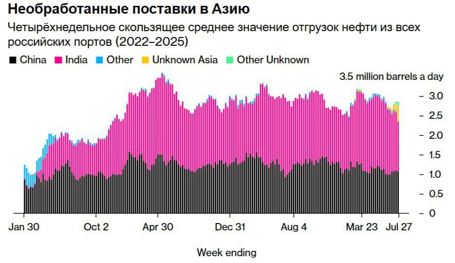 🇷🇺🛢Как устроен экспорт российской нефти и как на него повлияют санкции? На фоне новых заявлений Трампа о введении пошлин стоит вспомнить, а куда вообще идет российская нефть и правда ли эти пошлины могут ударить по эксперту? — 70-80% экспорта нефти осуществляется через море из-за сокращения трубопроводных поставок в Европу. Около 2,9 млн б/c в среднем экспортируется в страны Азии, в основном Индию и Китай. — Основными экспортными портами являются Усть-Луга и Приморск (70-75 млн т), 30 млн т идет через Новороссийск и еще 70-75 млн т через Козьмино. — Давление на мировые цены привело к активизации европейских судов, перевозящих российскую нефть (в основном греческих). Доля европейских судов в нефтепродуктах достигает 80%. Подробнее о тех, кто принимает российскую нефть. 🇪🇺 Европа. Основные бенефициары дешевой российской нефти — Венгрия и Словакия — через одну из веток трубопровода «Дружба». Нефтепродукты, произведенные из российской нефти, поступают в Европу через Индию, однако