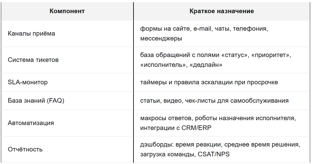 Прежде чем перейти к деталям, важно увидеть «скелет» любой службы поддержки: из каких блоков она состоит и как они взаимодействуют. Таблица ниже покажет, какие функции считаются базовыми, даже если вы начинаете с минимального набора инструментов.
