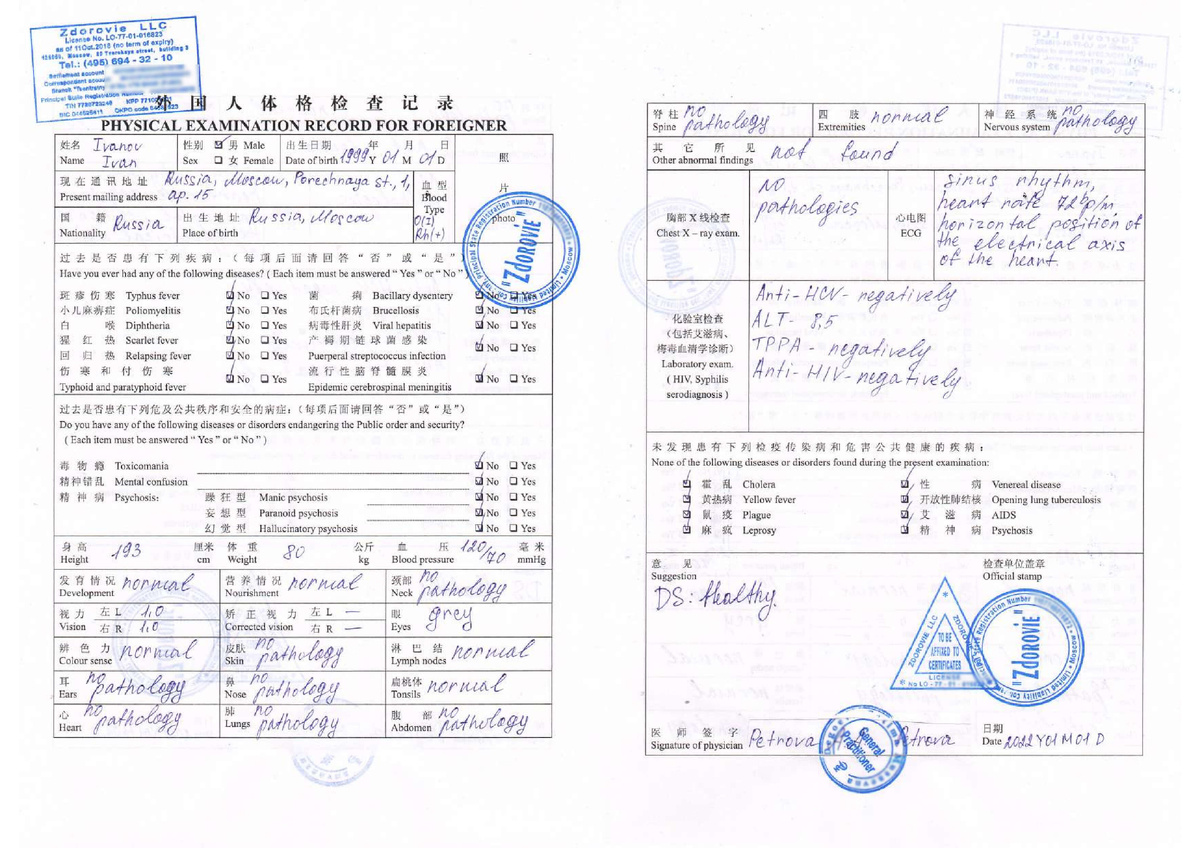 Если вы едете в Китай на работу или учёбу, потребуется медсправка. Её форма и содержание зависят от целей визита. 🔬 Какие анализы нужны: • Флюорография • ЭКГ • Анализы крови на ВИЧ, сифилис • Осмотр терапевта: зрение, давление, нервная и дыхательная системы и др. 📌 Как оформить справку в России: ✔ Обратитесь в любую клинику — аккредитации от посольства Китая не требуется ✔ Проверьте, чтобы справка имела живую печать и подпись врача ✔ Избегайте сканов и цветных копий — нотариус их не примет 📄 Варианты оформления: 1. Готовый бланк от китайского работодателя — заполните его в клинике, перевод и апостиль не нужны 2. Универсальная справка по результатам медосмотра — её нужно перевести на китайский язык, нотариально заверить и проставить апостиль 🧾 Апостиль на справку: Теперь медсправки не требуют консульской легализации — достаточно апостиля. Он ставится на нотариальную копию и перевод. ⚠️Важно: апостиль обязателен для признания документа в Китае. 📆 Сроки: оформление справки + апостил